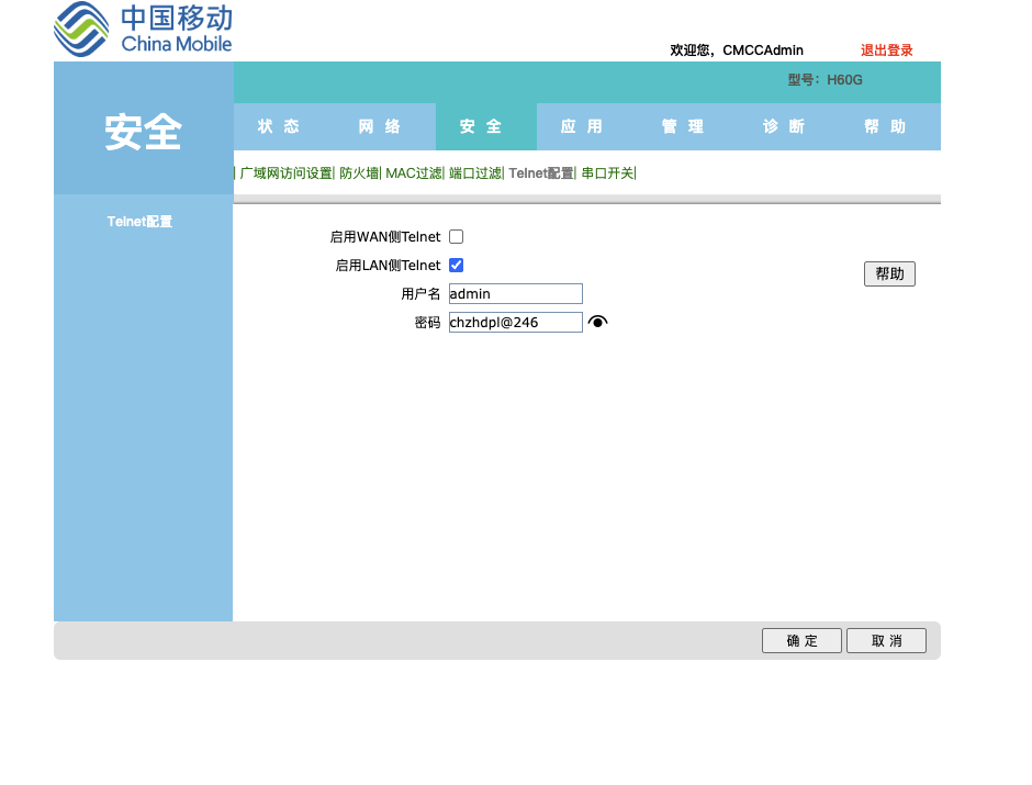 移动联通光猫H60G默认是没有动态管理员密码,本身默认的超级管理员和密码为